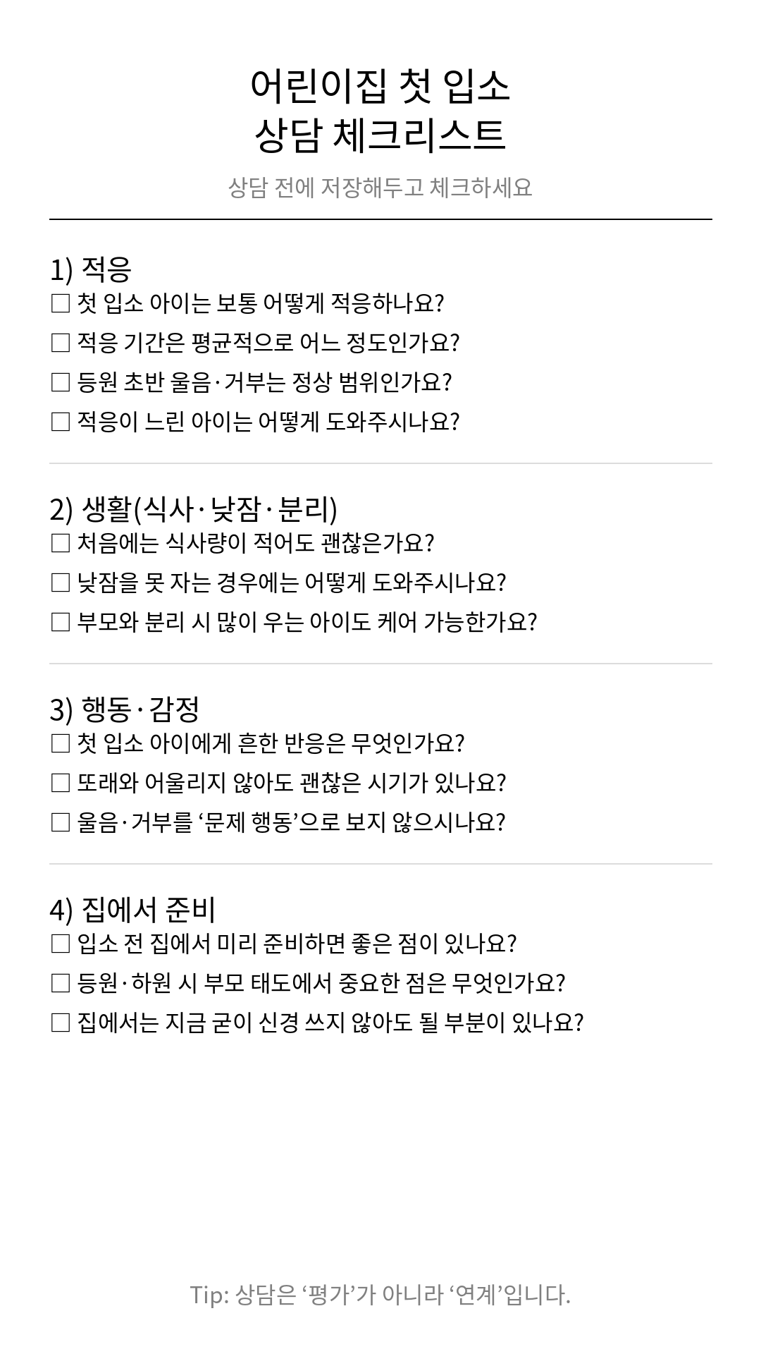 오늘 정리한 질문 리스트를 통해 아이도, 부모도, 어린이집도 조금 더 편안한 시작을 하시길 바랍니다.